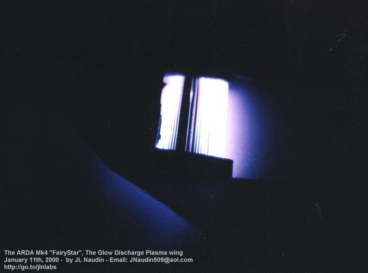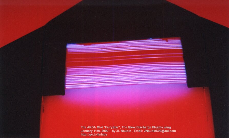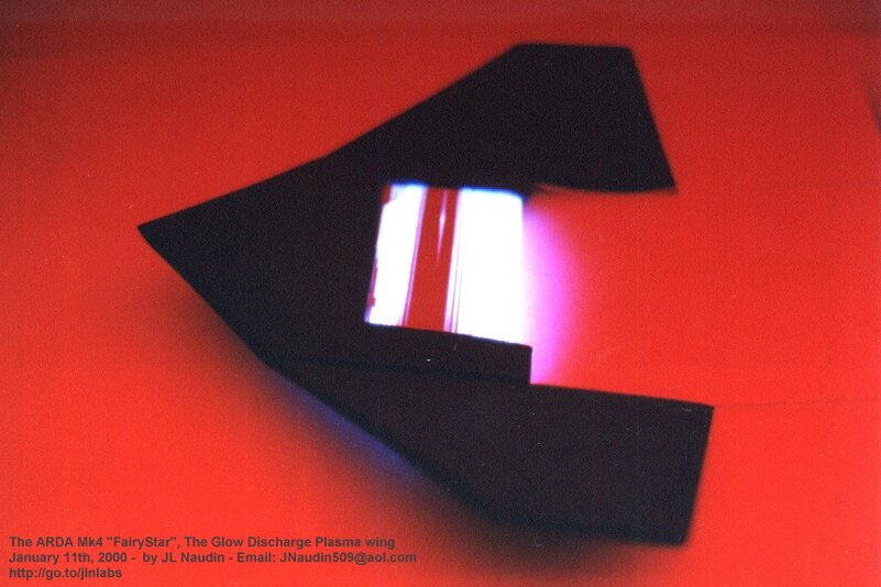 The ARDA Mk4 "FairyStar" uses the OAUGDP technology ( One Atmosphere Uniform Glow Discharge Plasma ). This is a first step towards a design of the full scale GDP Wing profile which will be used in a future ARDA Flying wing. In the ARDA "FairyStar" design, the wing uses a OAUGDP panel as a thruster covered by a glow discharge plasma at high voltage and at high frequency. A kind of GDP panel has already been successfully tested by the NASA Langley Research Center by Roth and Wilkinson and a full report has been presented during the 36th Aerospace Sciences Meeting in Reno (January 1998) and also in my lab on December 21th, 1999.