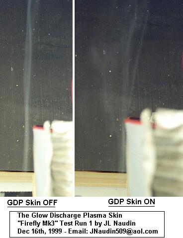 See the picture below, you may notice that when the plasma is off, the smoke flow goes up slowly and in a straight path. When the plasma is activated (GDP Skin ON), the smoke flow is accelerated (see the videos) and attracted stongly towards the GDP Skin due to the paraelectric forces which are indepedent of the polarity of the field.