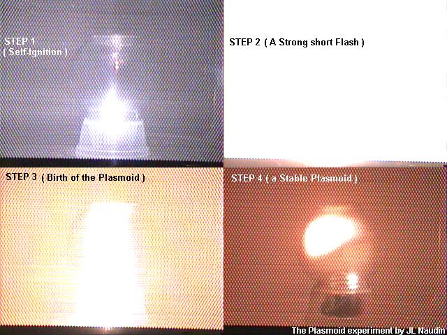 4) and then, a plasmoid coming from the igniter climbs up to the top of the transparent vessel and remains stable ( STEP 4 ) with a humming sound...