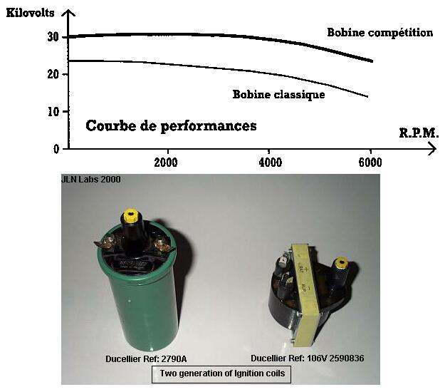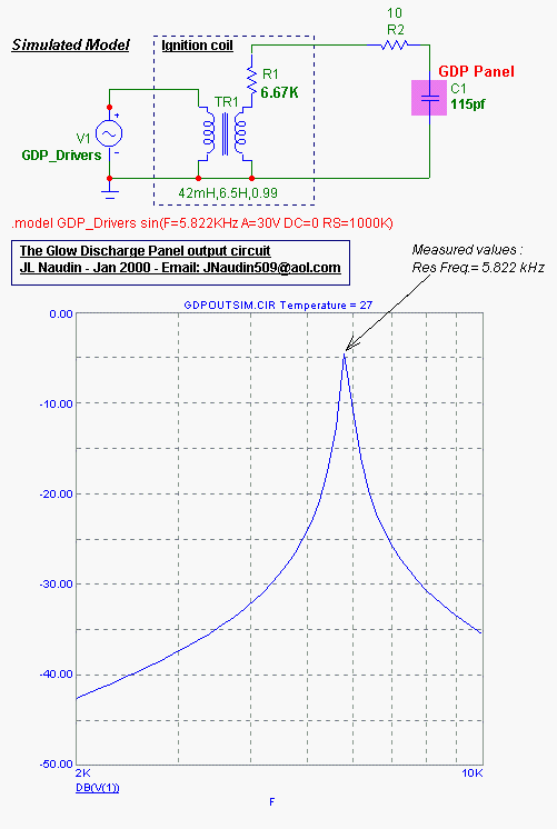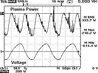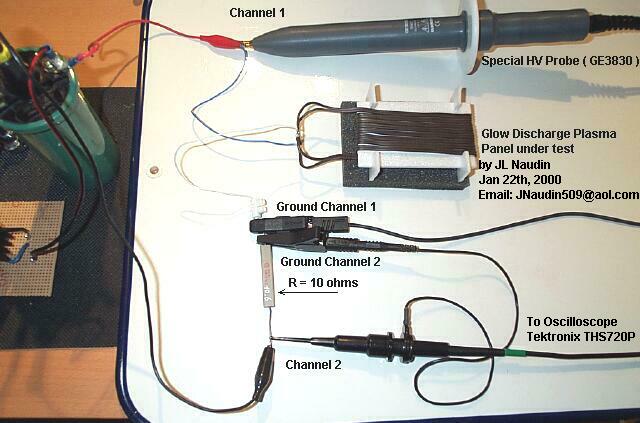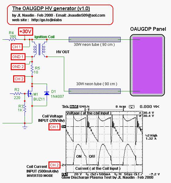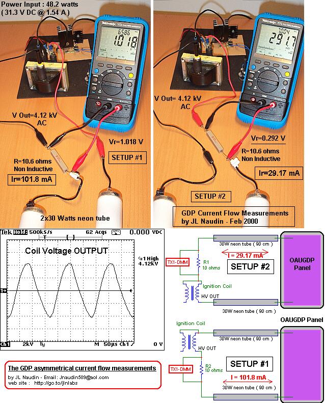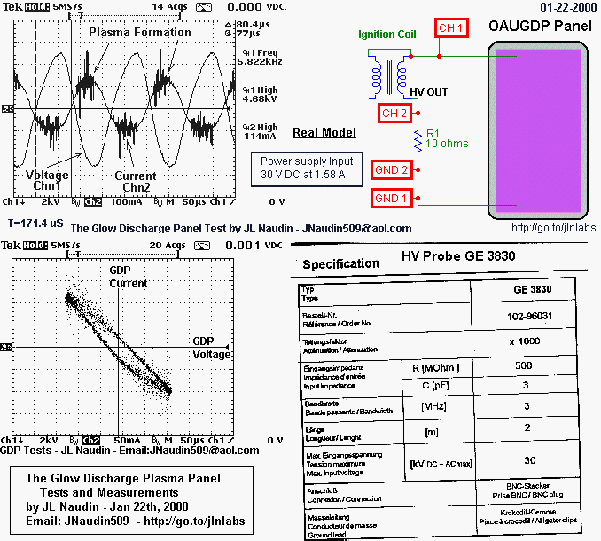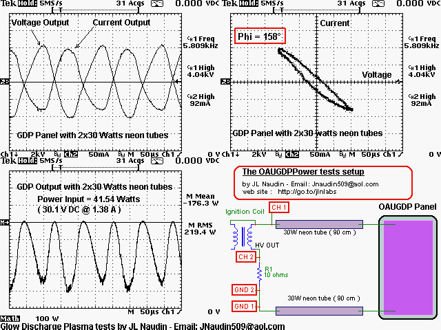- The upper left scope picture shows the Voltage and the Current curves measured at the GDP output. The Voltage is set at 2kV/div ( in inverted mode ( see the "downward arrow" on the right side of "Ch1", the current is set at 50mA/div ( the current has been measured on the R1 non inductive 10 ohms resistor, with a x10 probe, the scope input channel ratio has been set to 1000mV/A ), the time base used is 50us/div. The right side of the scope picture shows datas measured by the scope itself : on Ch1(Voltage) : freq=5.809 kHz at 4.04kV max and on Ch2(Current) : 92mA max.