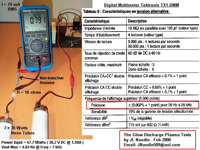 The direct output current from the GDP driver has been also checked with a digital multimeter ( Tektronix TX1 ) with High frequency measurements capabilities on AC voltage ( accuracy 0.002% at 20 kHz (see the specifications sheet below) ). The working frequency was 7 kHz, so this was in the working range of the TX-DMM. The voltage measured current was 0.791 Volt accross a 10 ohms ceramic ( non inductive ) resistor, this gives a current of 79 mA RMS. So, this confirms the previous oscilloscope measurements.